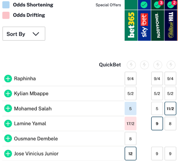 ตามด้วย คีลิยัน เอ็มบั๊ปเป้ สตาร์ เรอัล มาดริด (5/2) และ โมฮาเหม็ด ซาลาห์ แห่ง ลิเวอร์พูล (11/2)