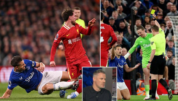 เจมี่ คาร์ราเกอร์ และ ดันแคน เฟอร์กูสัน สองนักวิเคราะห์ สกาย สปอร์ตส์ ประหลาดใจที่ เจมส์ ทาร์คอฟสกี้ กองหลัง เอฟเวอร์ตัน รอดใบแดงโดยตรงจังหวะหงายปุ่มเสียบ อเล็กซิส แม็ค อัลลิสเตอร์ กองกลาง ลิเวอร์พูล เกมที่ฝ่ายหลังเชือดนิ่ม 1-0
