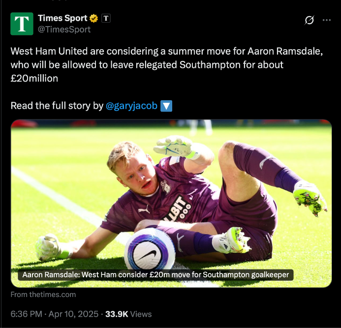 สโมสร เวสต์แฮม ยูไนเต็ด พิจารณายื่นข้อเสนอซื้อตัว อารอน แรมส์เดล นายด่านดีกรีทีมชาติอังกฤษ จาก เซาธ์แฮมป์ตัน ตลาดซัมเมอร์ 2025 เพราะเชื่อว่าฝีมือดีกว่าต้องลงไปเล่นลระดับแชมเปี้ยนชิพ