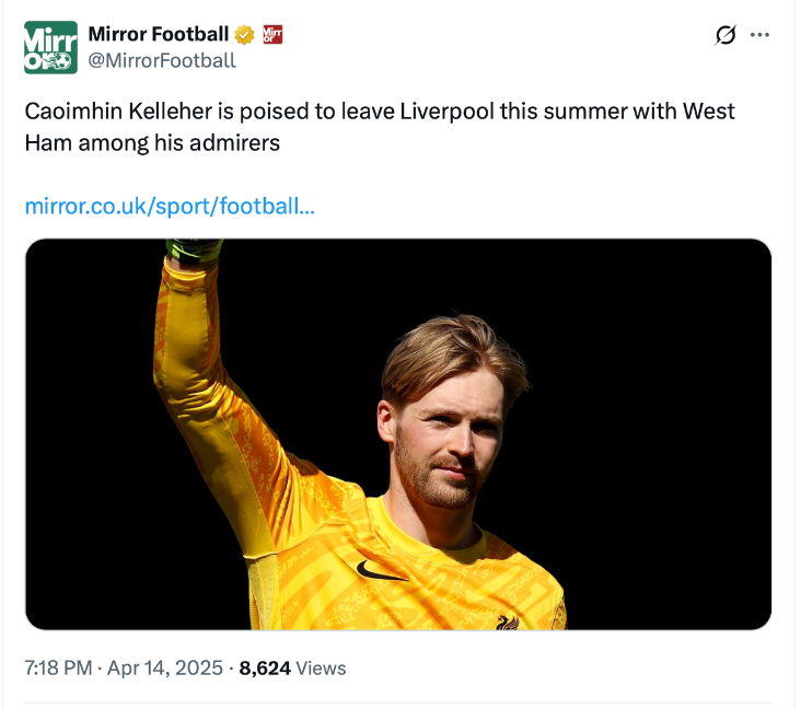 สโมสร เวสต์แฮม ยูไนเต็ด พิจารณายื่นข้อเสนอซื้อตัว ควีวิน เคลเลเฮอร์ นายด่านดีกรีทีมชาติไอร์แลนด์ จาก ลิเวอร์พูล ตลาดซัมเมอร์ 2025 เพราะเชื่อว่าฝีมือดีพอขึ้นเบอร์ 1 แล้ว