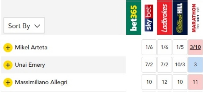 จึงไม่แปลกที่ราคาล่าสุดจาก 'สกาย เบท' เอเมรี่ เป็นเต็ง 2 อัตรา 7/2 (แทง 2 จ่าย 7 ไม่รวมทุน) เป็นรองเพียง อาร์เตต้า ด้วยเรต 1/6 (แทง 6 จ่าย 1 ไม่รวมทุน) เพียงรายเดียว