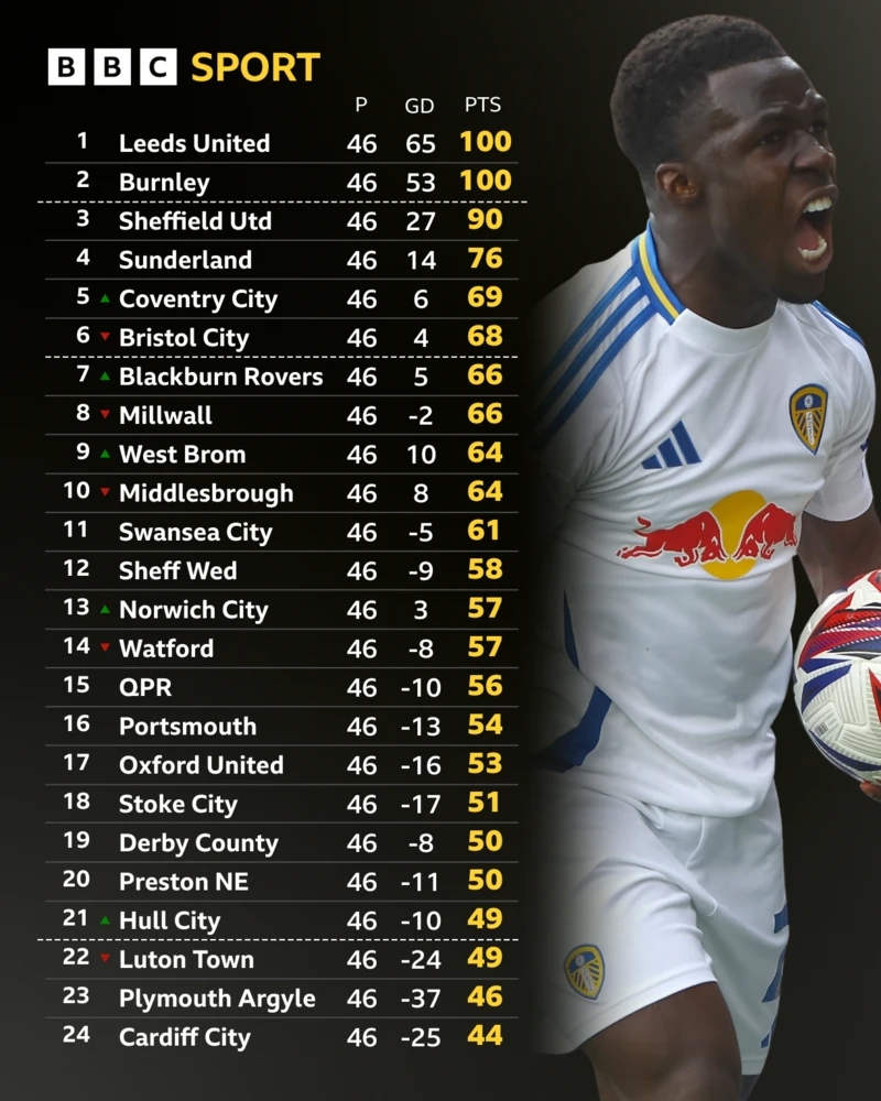 ลีดส์ ยูไนเต็ด คว้าแชมป์แชมเปี้ยนชิพ ด้วยผลงาน 100 แต้มในเกมปิดฤดูกาล เช่นเดียวกับ เบิร์นลี่ย์ ที่เลื่อนชั้นขึ้นมาด้วยกัน ขณะที่ ลูตัน ทาวน์ ร่วงตกชั้น 2 ฤดูกาลติดต่อกัน