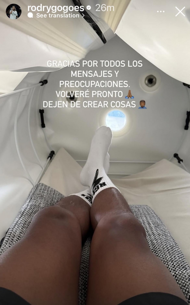 "ขอบคุณทุกข้อความและความห่วงใย ผมจะกลับมาในเร็ววันนี้ และหยุดสร้างเรื่องได้แล้ว" ข้อความในสตอรี่ของ โรดรีโก้