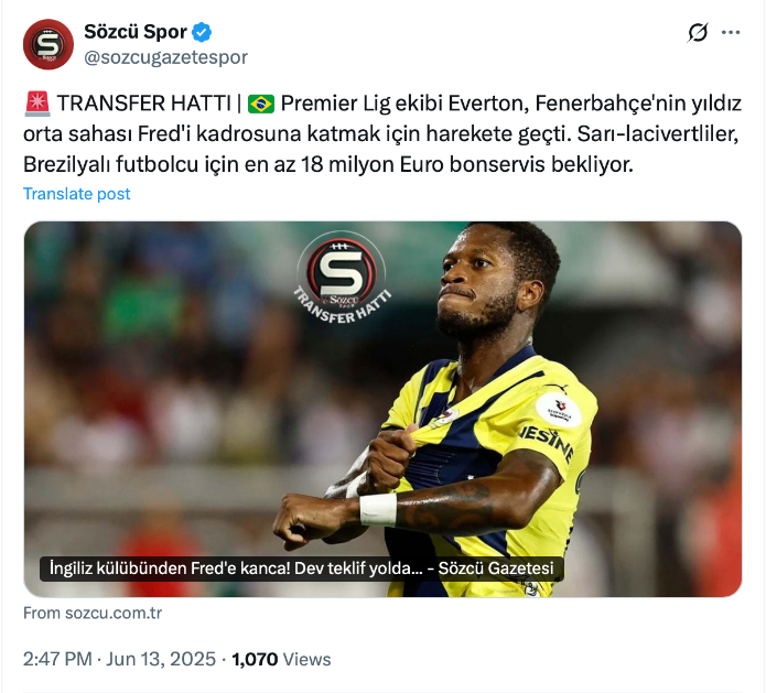 สโมสร เอฟเวอร์ตัน มองความเป็นไปได้เรื่องคว้า เฟร็ด กองกลางดีกรีทีมชาติบราซิลจาก เฟเนร์บาห์เช่ ในตลาดซัมเมอร์ 2025 เพราะโควตามิดฟิลด์ว่างพอดี