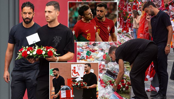 รูเบน อาโมริม ผู้จัดการทีม แมนฯ ยูไนเต็ด พร้อมด้วย บรูโน่ แฟร์นันด์ส และ ดีโอโก้ ดาโลต์ ร่วมวางดอกไม้เพื่อไว้อาลัย ดีโอโก้ โชต้า เพื่อนร่วมชาติชาวโปรตุเกส และ อันเดร ซิลวา น้องชาย ในนามตัวแทนของสโมสร ที่สนามแอนฟิลด์