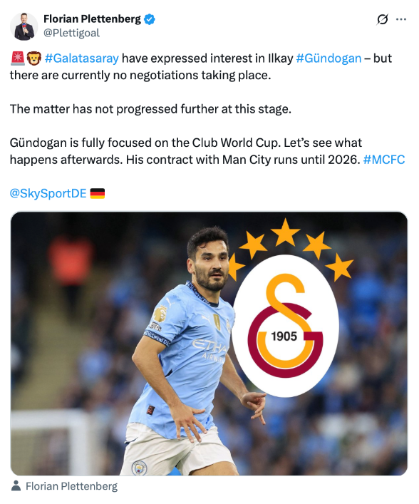 อิลฮาน กุนโดอาน คุณอา/เอเยนต์ส่วนตัวของ อิลคาย กุนโดอาน กองกลาง แมนฯ ซิตี้ บอกไม่ทราบเช่นกันว่ากระแสเชื่อมโยงโยกย้ายสู่ กาลาตาซาราย แห่งซูเปอร์ลีก ตุรเคีย มาจากไหน เพราะไร้การทาบทามมาจากค่ายใดๆเลย