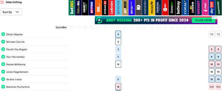 ส่วนเต็งรองๆลงมาได้แก่ แกเร็ธ เซาธ์เกต อดีตผจก.ทีมชาติอังกฤษ (5/1) ที่ว่างงานอยู่