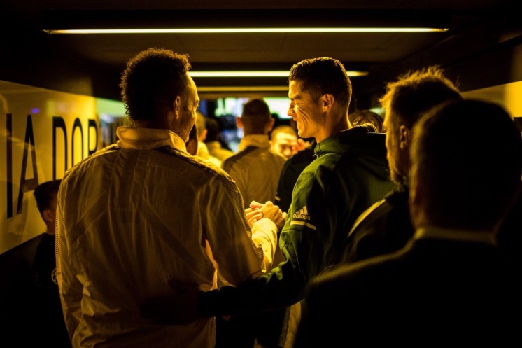 ภาพจากในอุโมงค์ก่อนลงสนามระหว่าง โอบาเมย็อง (ซ้าย) กองหน้า ดอร์ทมุนด์ จับมือกับ โรนัลโด้ (ขวา)