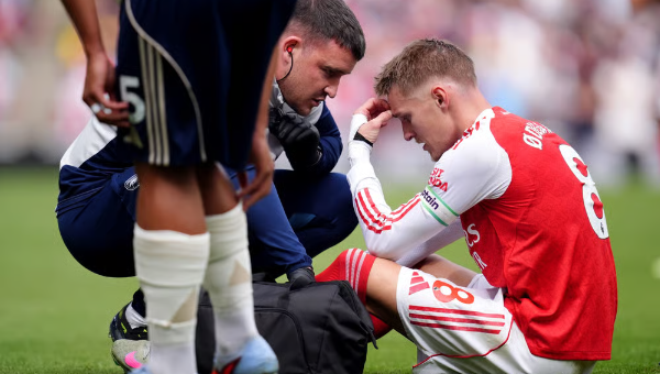 โอเดการ์ด เดี้ยงตั้งแต่นาที 7 เมื่อถูกเสียบแย่งบอลจาก มอร์แกน กิ๊บบ์ส-ไวท์ แข้ง ‘เจ้าป่า’ หน้าเขตโทษคู่แข่ง แม้พยายามโดดหนีแต่ก็ยังไม่พ้นเพราะทีมเมต ยูร์เรียน ทิมเบอร์ ก็สไลด์ดักหน้าอยู่อีกคน ส่งผลร่วงเอาไหล่ขวาฟาดพื้นอย่างแรง