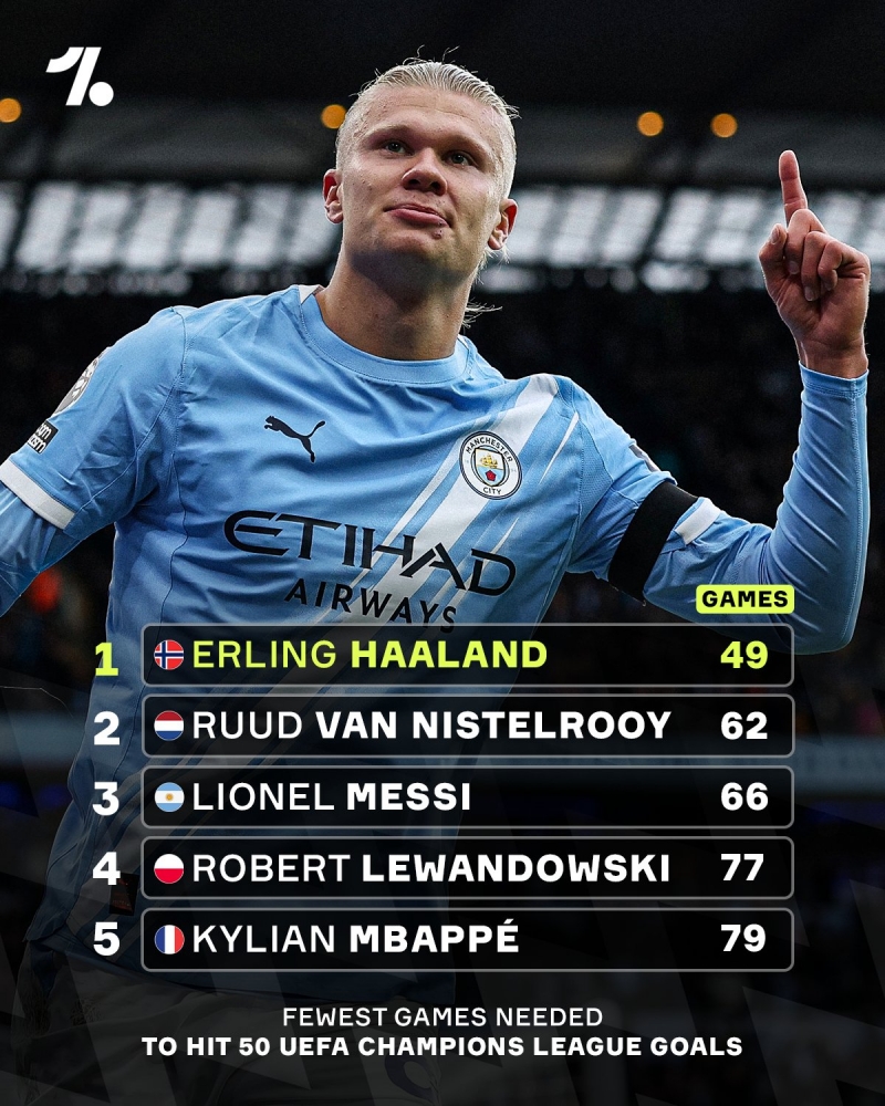 เออร์ลิง ฮาแลนด์ กลายเป็นผู้เล่นที่ทำประตูครบ 50 ลูกเร็วที่สุดในประวัติศาสตร์แชมเปี้ยนส์ ลีก