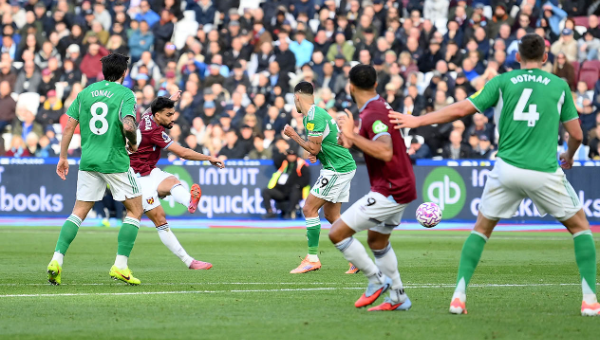 เวสต์แฮม น่าจะได้ประตูตีเสมอในนาที 31 จากฟรีคิกที่ ลูคัส ปาเกต้า ยิงเรียดผ่านกำแพงกำลังจะเสียบเสา แต่ นิค โป๊ป ล้มตัวปัดออกหลังหวุดหวิด