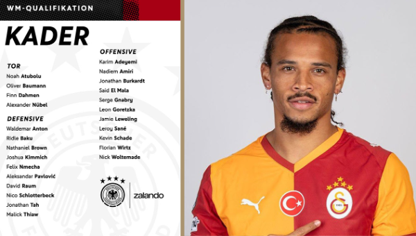 ลีรอย ซาเน่ ปีกความเร็วสูงที่ปัจจุบันค้าแข้งอยู่กับ กาลาตาซาราย ได้กลับมาติดธง "อินทรีเหล็ก" อีกครั้ง หลังจากที่ห่างหายไปตั้งแต่การแข่งขันยูฟ่า เนชั่นส์ ลีก รอบสุดท้ายเมื่อช่วงกลางปีที่ผ่านมา