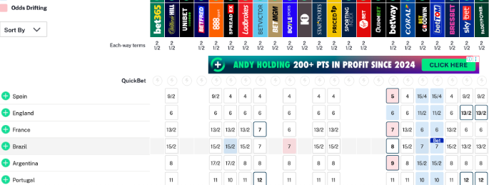 ไล่เรียงลงมาที่น่าสนใจได้แก่เต็ง 3 ฝรั่งเศส (13/2), เต็งสี่ บราซิล (15/2)และเต็งห้าแชมป์เก่า อาร์เจนตินา (8/1)