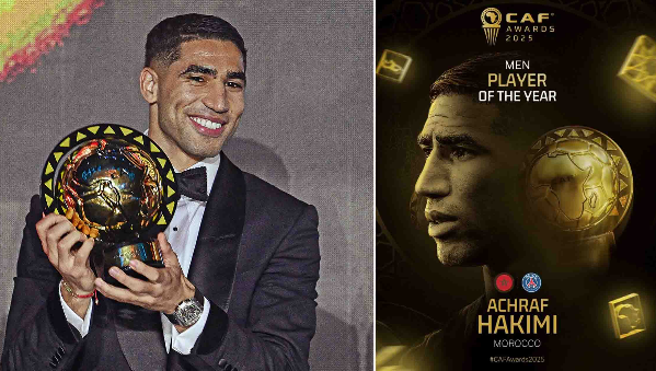 อาชราฟ ฮาคิมี่ แบ็กขวาทีมชาติโมร็อกโก คว้ารางวัลนักฟุตบอลยอดเยี่ยมแห่งปีของแอฟริกา ประจำปี 2025 ในงานประกาศรางวัลสมาพันธ์ฟุตบอลแอฟริกา (CAF) ที่กรุงราบัต นับเป็นค่ำคืนแห่งความสำเร็จของชาติเจ้าภาพ