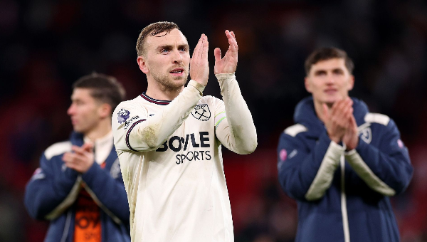 จาร์ร็อด โบเว่น กัปตันทีมเวสต์แฮม ชูสปิริตนักสู้ของเพื่อนร่วมทีม หลังตามตีเสมอแมนฯ ยูไนเต็ด 1-1 ที่โอลด์ แทร็ฟฟอร์ด