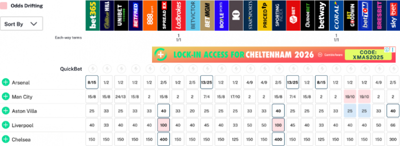 อัตราต่อ-รองแชมป์พรีเมียร์ ลีก อังกฤษ ล่าสุดจาก ‘วิลเลี่ยม ฮิลล์’ ให้ อาร์เซน่อล เต็งหนึ่งเรต 1/2 (แทง 2 จ่าย 1 ไม่รวมทุน ) ค่อยตามด้วย แมนฯ ซิตี้ 15/8 และ แอสตัน วิลล่า เต็งสามเท่า ลิเวอร์พูล 33/1