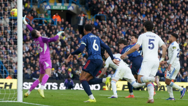 แต่หลังจากนั้น ปืนใหญ่ เหมือนเริ่มหาจังหวะของตัวเองเจอ และก็ได้เตะมุมถี่ๆ กระทั่งนาทีที่ 27 ลีดส์ สกัดลูกเตะมุมของ อาร์เซน่อล ออกมา เดแคลน ไรซ์ เก็บได้แล้วไหลออกขวาให้ โนนี่ มาดูเอเก้ แต่งเข้าเท้าซ้ายแล้วเปิดเข้าเขตโทษ มาร์ติน ซูบีเมนดี้ สอดมาโหม่งเช็ดที่เสาแรกเข้าประตูไป
