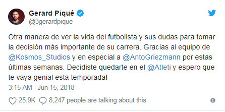 สตาร์ทีมตราหมีออกมาประกาศว่าจะอยู่ค้าแข้งกับทีมต่อไปหลังจากที่ตกเป็นข่าวกับทีมแชมป์ลา ลีกามาอย่างยาวนาน โดยเซนเตอร์เจ้าบุญทุ่มที่อยู่ในแคมป์ทีมชาติสเปนโพสต์ผ่านทวิตเตอร์อวยพร กรีซมันน์ โชคดีกับการตัดสินใจ