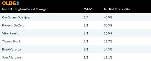 เบต วิคเตอร์ บ่อนถูกกฎหมายเจ้าดังเปิดอัตราต่อ-รองหัวหน้าผู้ฝึกสอนใหม่ของ ฟอเรสต์ โดยยกให้ โอเล่ กุนนาร์ โซลชา อดีตผจก.ทีม แมนฯ ยูไนเต็ด เต็งหนึ่งเรต 6/4 (แทง 4 จ่าย 6 ไม่รวมทุน)