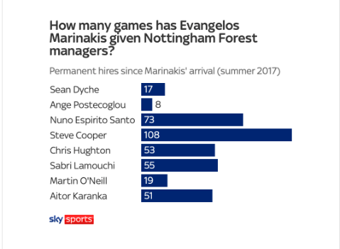 เอวานเจลอส มารินาคิส เจ้าของ น็อตติ้งแฮม ฟอเรสต์ ก้าวขึ้นไปอยู่หัวแถววงการเรื่องปลดหัวหน้าผู้ฝึกสอน เพราะตั้งแต่เข้ามาบริหารองค์กรเมื่อซัมเมอร์ 2017 ถึงเวลานี้สั่งกุนซือไปแล้ว 8 ราย สดๆร้อนๆ ฌอน ไดช์