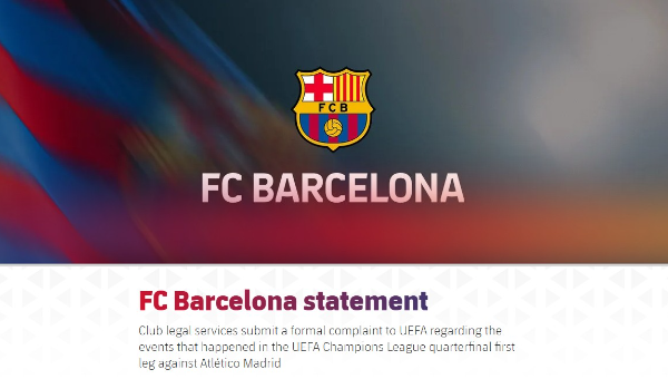 บาร์เซโลน่า แถลงยืนยันว่าฝ่ายกฎหมายของสโมสรได้ดำเนินการยื่นคำร้องต่อ ยูฟ่า อย่างเป็นทางการ เพื่อให้ตรวจสอบเหตุการณ์ที่เกิดขึ้นในศึกยูฟ่า แชมเปี้ยนส์ ลีก รอบ 8 ทีมสุดท้าย นัดแรก ที่พบกับ แอตเลติโก มาดริด
