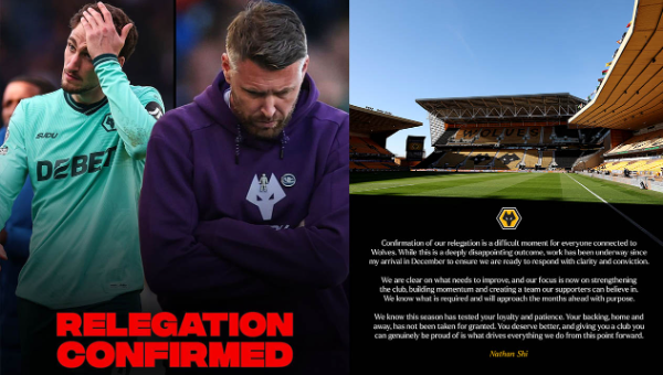 วูล์ฟแฮมป์ตัน วันเดอเรอร์ส ออกแถลงการณ์อย่างเป็นทางการผ่านทาง นาธาน ชิ ตัวแทนฝ่ายบริหาร ภายหลังจากมีการยืนยันการตกชั้นจากพรีเมียร์ลีกอย่างเป็นทางการ โดยระบุว่าเป็นช่วงเวลาที่ยากลำบากและน่าผิดหวังอย่างยิ่งสำหรับทุกคนที่มีส่วนเกี่ยวข้องกับสโมสร ไม่ว่าจะเป็นสตาฟฟ์ นักเตะ หรือแฟนบอลทั่วโลก