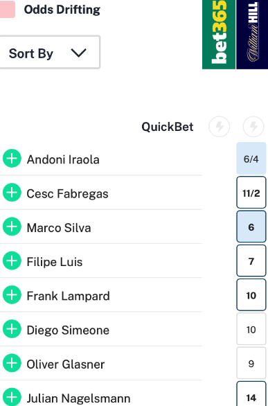 เต็งรองลงมาได้แก่ เชส ฟาเบรกาส เฮดโค้ช โคโม่ (11/2), มาร์โค ซิลวา บอส ฟูแล่ม (6/1), เฟลิเป้ ลุยซ์ (7/1) อดีตเทรนเนอร์ ฟลาเมงโก้ ซึ่งว่างงานขณะนี้