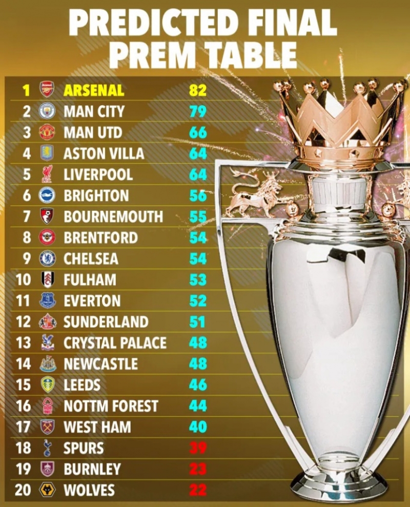 ส่วนทีมที่จะคว้าตั๋วลุย ยูฟ่า แชมเปี้ยนส์ ลีก มี แมนเชสเตอร์ ยูไนเต็ด (66 คะแนน), แอสตัน วิลล่า (64 คะแนน) และ ลิเวอร์พูล (64 คะแนน) นอกจากนี้การวิเคราะห์ยังบอกว่าทั้ง ไบรท์ตัน (56 คะแนน), บอร์นมัธ (55 คะแนน) และ เบรนท์ฟอร์ด (54 คะแนน) จะจบในอันดับที่เหนือกว่า เชลซี (54 คะแนน) อีกด้วย