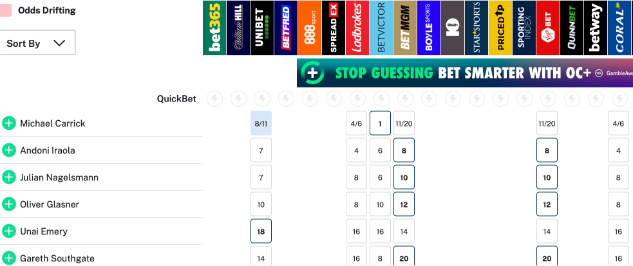 ต่อที่เต็งสามร่วมเรต 8/1 (แทง 1 จ่าย 8 ไม่รวมทุน) มี โอลิเวอร์ กลาสเนอร์ ที่กำลังจะหมดสัญญาจาก คริสตัล พาเลซ พร้อมดีกรีคุมทีมเป็นแชมป์มาแล้ว อัตราเท่า ยูเลี่ยน นาเกลส์มันน์ เทรนเนอร์ทีมชาติเยอรมัน