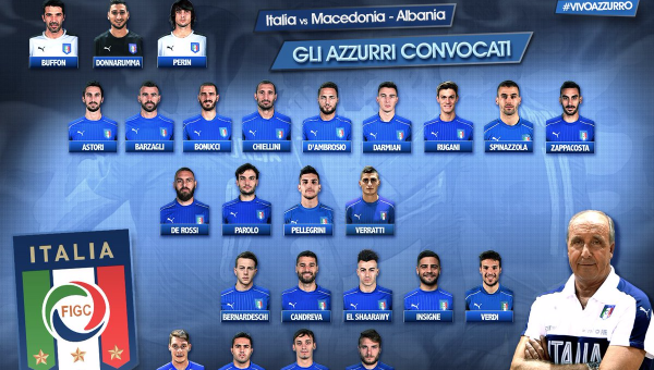 นายใหญ่อัซซูรี่เรียกตัว สเตฟาน เอล ชาราวี ที่กำลังผลงานดีกับโรม่า มาติดทีมรวมไปถึง ซิโมเน่ แวร์ดี้ ปีกจากโบโลญญ่า นอกจากนี้ยังมี ดาวิเด้ ซัปปาคอสต้า จากเชลซี รวมไปถึง มาโนโล่ กับเบียดินี่ ของเซาธ์แฮมป์ตัน ที่ได้โอกาสเช่นกัน