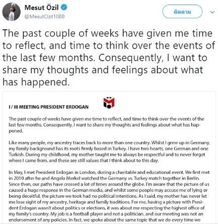 เมซุต โอซิล จอมทัพทีมชาติเยอรมนี ถึงเวลาเปิดใจกรณีรูปปัญหาที่ถ่ายคู่กับ เรเซป ทายยิป เออร์โดกัน ประธานาธิบดีตุรกี จนกลายเป็นเรื่องราวใหญ่โต