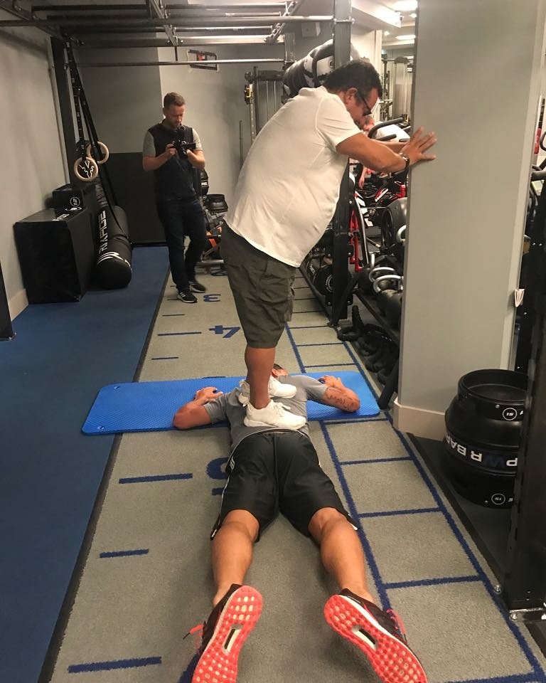 ซลาตัน อิบราฮิโมวิช กองหน้าจอมเก๋า ทำฮือฮาลงภาพในโซเชียลขณะที่ตัวเองนอนราบบนพื้นและมี มิโน ไรโอล่า เอเยนต์คู่ใจขึ้นเหยียบที่แผ่นหลังราวกับกำลังนวดแก้เมื่อย