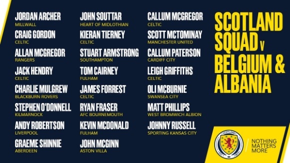 อเล็กซ์ แม็คลีช กุนซือทีมชาติสกอตแลนด์ ประกาศรายชื่อทีมที่จะลงเตะสองนัดเจอกับ เบลเยียม กับ อัลเบเนีย ในช่วงต้นเดือนหน้า