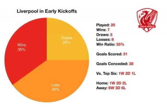 อนึ่งนับตั้งแต่ได้ เจอร์เก้น คล็อปป์ มาเป็นผู้จัดการทีม 'เดอะ เร้ดส์' เมื่อปี 2015 ทีมเตะก่อน 13.30 น. (ตามเวลาท้องถิ่น) ทั้งหมด 20 ครั้ง ทุกรายการเปอร์เซนต์ชนะเพียง 35% เท่านั้น