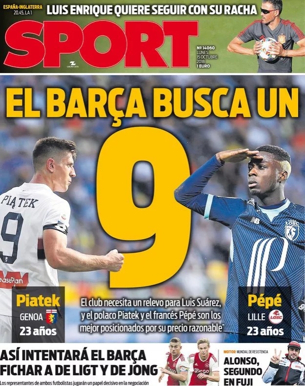 สปอร์ต สื่อดังของสเปนเผย บาร์เซโลน่า ทีมดังจากลา ลีกา กำลังตัดสินใจว่าจะทุ่มเงินซื้อตัว คริสตอฟ พิออนเท็ค กองหน้าของ เจนัว หรือ นิโกล่าส์ เปเป้ ตัวรุกจากลีลล์