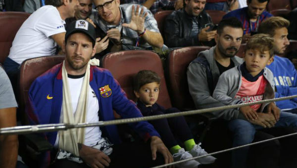 ทั้งนี้ เมสซี่ ที่มาพร้อมเครื่องพยุงแขนขวาได้พาลูกชายคนโต ติอาโก้ เดินทางไปยัง คัมป์ นู เพื่อให้กำลังทีมรักที่ลงสนามในเกมยูฟ่า แชมเปี้ยนส์ ลีก รอบแบ่งกลุ่มกับ อินเตอร์