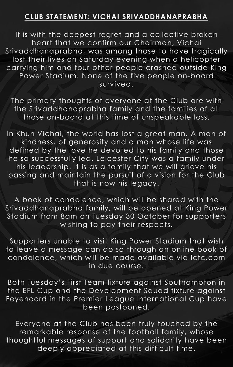 "ถือเป็นความเสียใจอย่างสุดซึ้งและทำให้หัวใจสลาย โดยเราขอยืนยันว่าคุณวิชัย ศรีวัฒนประภา ประธานสโมสรของพวกเรา เป็นหนึ่งในผู้เสียชีวิตจากเหตุการณ์เฮลิค็อปเตอร์ตกนอกบริเวณสนาม คิง พาวเวอร์ สเตเดียม เมื่อคืนวันเสาร์ที่ผ่านมา"