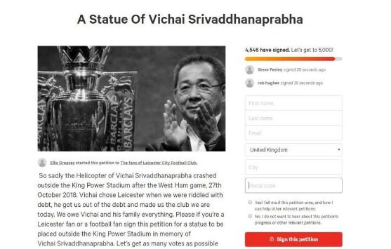 แฟนบอล เลสเตอร์ ซิตี้ จำนวนมาก เรียกร้องให้ทางสโมสรสร้างรูปปั้นเพื่อเป็นเกียรติแก่ประธานสโมสร วิชัย ศรีวัฒนประภา ที่เสียชีวิตด้านนอกสนาม