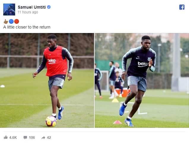 ซามูแอล อูมติตี้ กองหลังของ บาร์เซโลน่า โพสต์ภาพตัวเองกลับมาซ้อมกับทีมได้แล้วหลังพักรักษาตัวมาร่วมสองเดือน