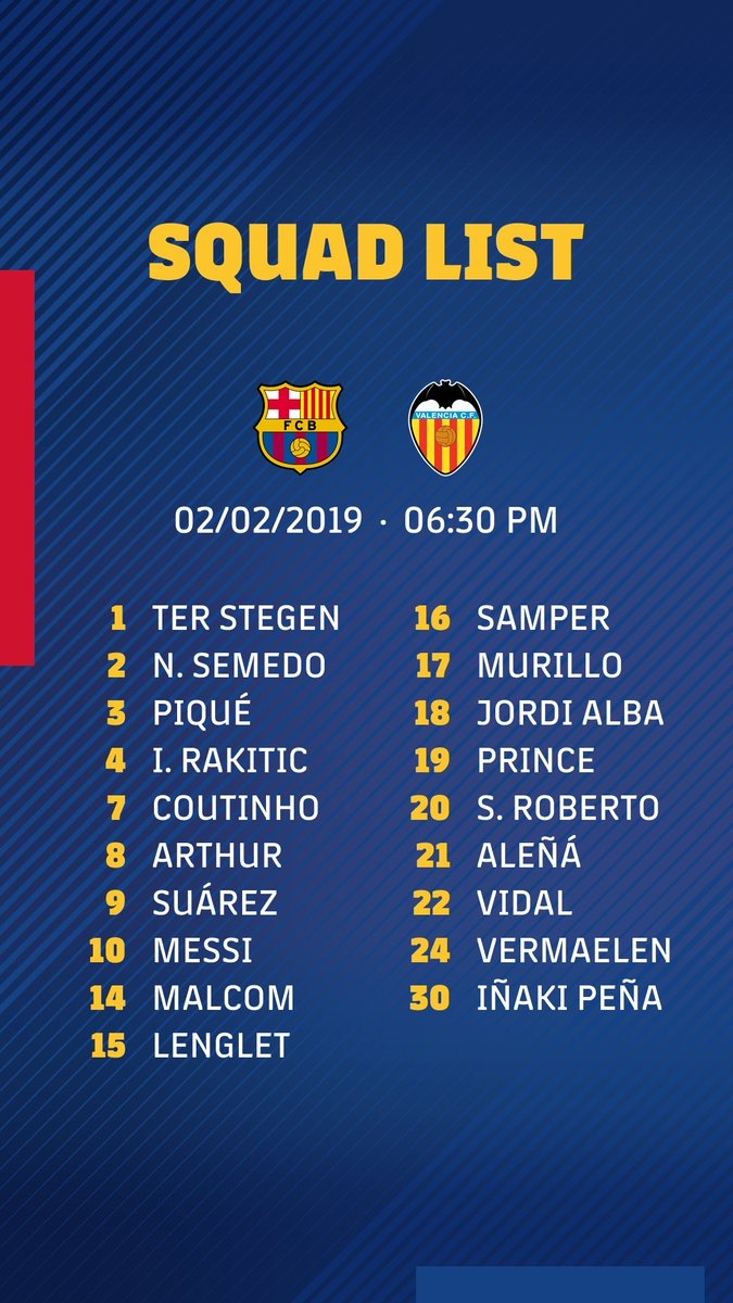 สำหรับผู้เล่น 19 คนของบาร์เซโลน่าประกอบด้วย : แทร์ ชเตเก้น, เซเมโด้, ปิเก้, ราคิติช, อาร์ตูร์, ซัวเรซ, เมสซี่, มัลคอล์ม, ล็องเล่ต์, ซัมเปร์, มูรีโญ่, จอร์ดี้ อัลบา, พรินซ์-บัวเต็ง, เซร์จี้ โรแบร์โต้, อเลญ่า, วีดาล, แฟร์มาเล่น และ เปญ่า