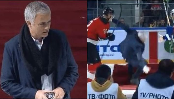 โชเซ่ มูรินโญ่ อดีตผู้จัดการทีมแมนเชสเตอร์ ยูไนเต็ด เสียท่าอีกครั้งเมื่อลื่นล้มขณะที่ได้รับเชิญไปเป็นคนวางลูกพัคเปิดเกมการแข่งขันฮ็อคกี้น้ำแข็ง