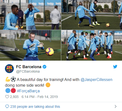 ยาสเปอร์ ซิลเลสเซ่น ผู้รักษาประตูบาร์เซโลน่า กลับมาซ้อมกับเพื่อนร่วมทีมได้เป็นที่เรียบร้อยแล้วหลังก่อนหน้านี้มีรายงานว่าต้องพักจนถึงเดือนมีนาคม