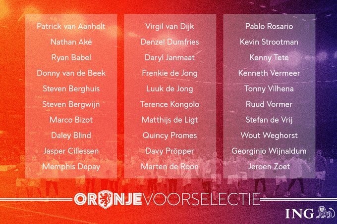 โรนัลด์ คูมัน เรียกระดมพลผู้เล่นทีมชาติฮอลแลนด์รวม 30 คนสำหรับการลงเล่นรอบคัดเลือกของศึกยูโร 2020 ที่มีคิวพบกบ เบลารุส และ เยอรมัน ในช่วงปลายเดือนมีนาคมนี้ จากทวิตเตอร์ของสหพันธ์ฟุตบอลฮอลแลนด์เมื่อวันพุธที่ผ่านมา