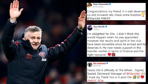 ริโอ เฟอร์ดิานด์, แกรี่ เนวิลล์, ปีเตอร์ ชไมเคิ่ล และ ดีเอโก้ ฟอร์ลัน สี่ศิษย์เก่า แมนฯ ยูไนเต็ด ต่างร่วมยินดีที่ โอเล่ กุนนาร์ โซลชา อดีตทีมเมตได้รับการโปรโมทจากรักษาการผจก.ทีม ปีศาจแดง มาเป็นฟูลไทม์ระยะยาว 3 ปี