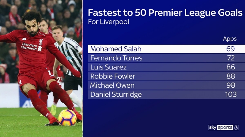 ส่วนสถิติยิง 50 ประตูเร็วสุดของพรีเมียร์ลีกทำไว้โดย อลัน เชียเรอร์ ที่ 66 นัด ตามด้วย รุด ฟาน นิสเตลรอย ที่ 68 นัด ส่วน ซาลาห์ รั้งอันดับ 3