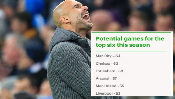 ส่วนการเรียงลำดับ โอกาสเกมที่ลงแข่งจากมากไปน้อยของทีม 'บิ๊ก 6' คือ แมนฯ ซิตี้ : 64 นัด, เชลซี: 63 นัด, ท็อตแน่ม : 58 นัด, อาร์เซน่อล : 57 นัด, แมนฯ ยูไนเต็ด 55 นัด และ ลิเวอร์พูล : 53 นัด