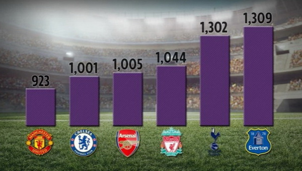 อันดับ 4 เป็นของหงส์แดงที่เสียไป 1,044 ประตู ตามด้วย สเปอร์ส ที่ 5 จำนวน 1,302 ลูก และสุดท้ายก็คือทีมทอฟฟี่ 1,309 เม็ด