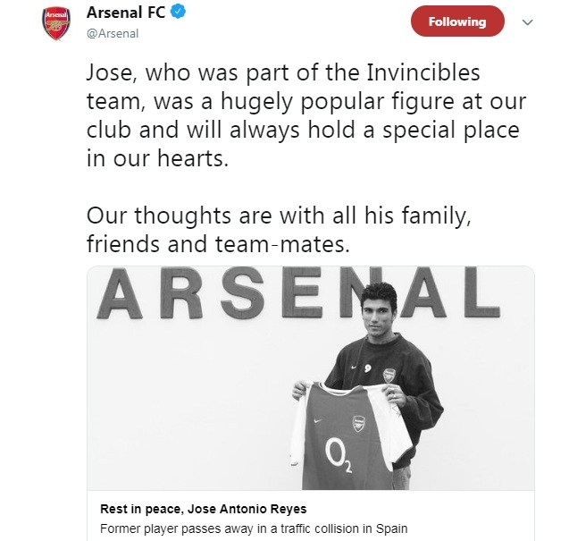 เธียร์รี่ อองรี ตำนานกองหน้า อาร์เซน่อล ทวีตข้อความแสดงความเสียใจต่อการจากไปอย่างไม่มีวันกลับของ โฆเซ่ อันโตนิโอ เรเยส ทีมเมตปืนใหญ่ชุดแชมป์ไร้พ่าย โดยบอกว่านี่คือเพื่อนที่นิสัยดีสุดคนหนึ่งของวงการ