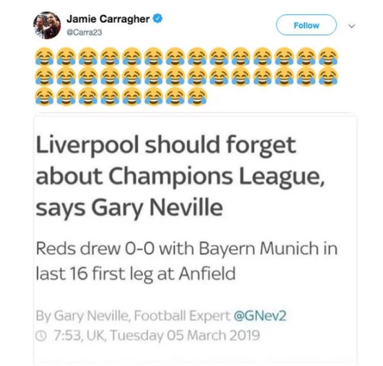 งานนี้ทาง คาร์ราเกอร์ ได้ทีเอาคืนเพื่อนร่วมงานกูรูทางสกาย สปอร์ตส์ โดยแคปหัวข่าวที่ แกรี่ บอกเอาไว้ว่าให้ ลิเวอร์พูล ลืมถ้วยยูฟ่า แชมเปี้ยนส์ ลีกไปซะ พร้อมอิโมจิหัวเราะน้ำตาไหลยาวเป็นพรืด