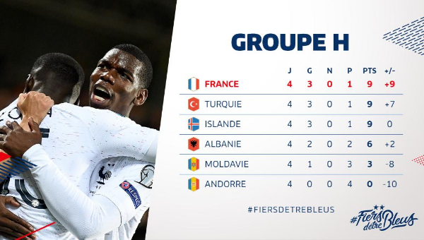 'เลส์ เบลอส์' สลับหน้ายิงไม่ซ้ำจาก คีลิยัน เอ็มบั๊ปเป้, วิสซาม เบน เยแดร์, ฟลอริย็อง โตแว็ง และ เคิร์ท ซูม่า เก็บคะแนนที่ 9 จากการลงสนามสี่นัด เท่ากับ ตุรกี และ ไอซ์แลนด์ ทว่าเมื่อคิดแบบ มินิลีก 'ตราไก่' ผลงานดีกว่าใครจึงรั้งอันดับ 1